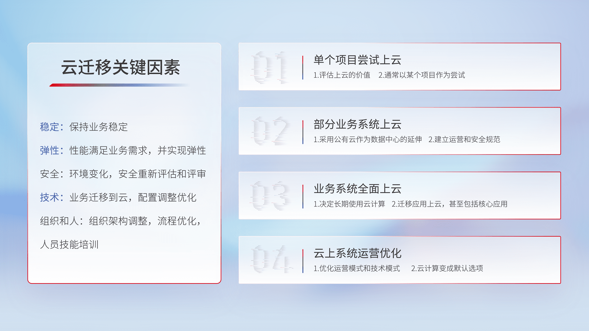 结合实际业务,,,从规划设计、、、云平台选型、、云原生改造、、数据迁移、、集成交付,,,,迁移全过程为客户识别最佳上云路径,,,,做好风险识别管理,,,,设计网络架构、、身份权限、、、安全审计合规、、、操作审计、、、日志审计、、监控告警策略、、、多站点容灾设计等,,,,对云上基础设施进行整体规划,,,,提升IT治理水平,,以满足弹性、、、高可用、、、、高性能的需求。。。