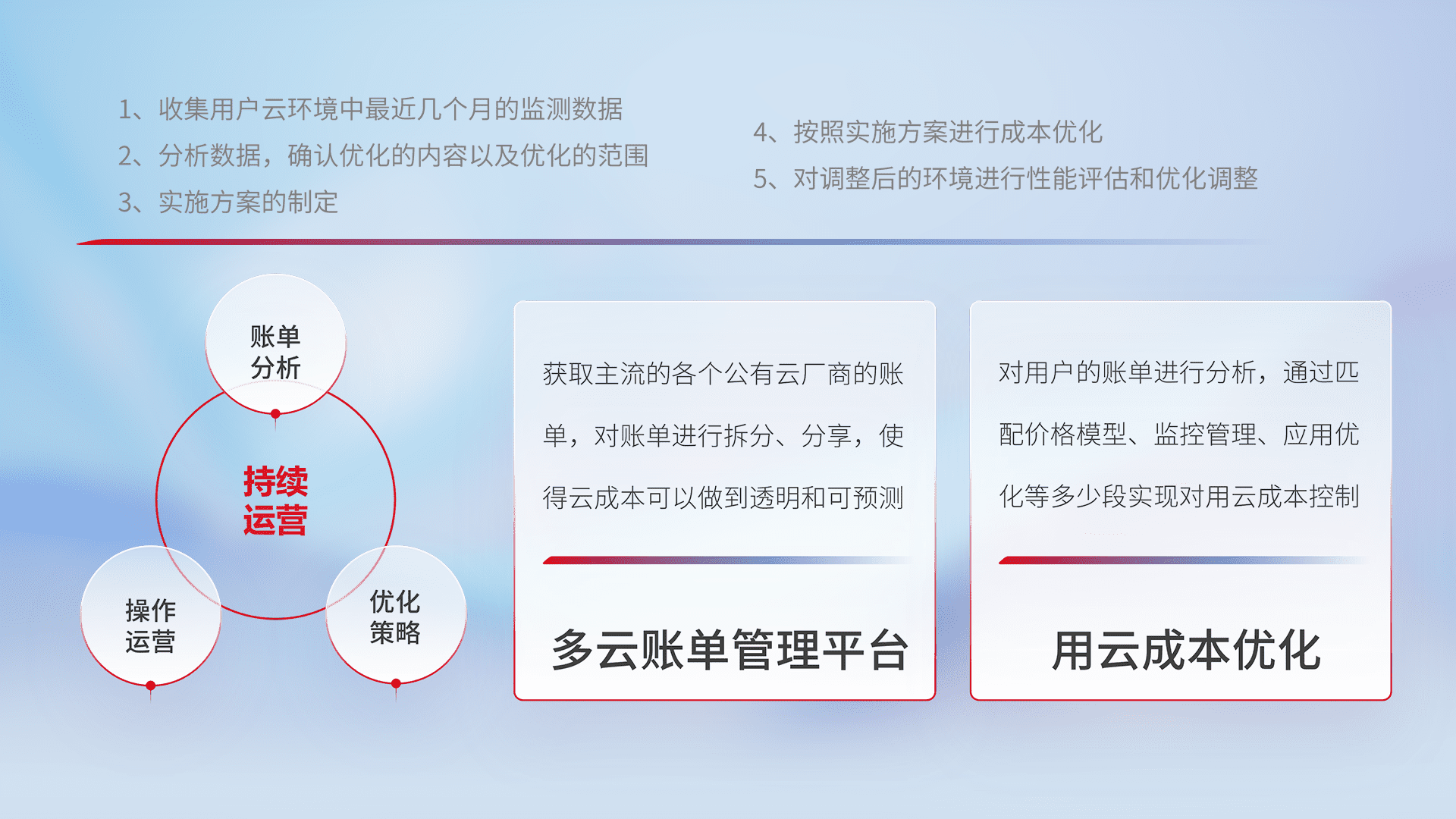 通过多云纳管,,以统一的资源数据模型把客户的云资源进行抽象和封装,,,,进而实现对多云资源的统一操作,,保障云资源管理的可靠性、、、、稳定性与可用性。。。。量身定制化运维内容,,配置、、、开发运维、、、补丁管理、、备份、、、、监控、、、、认证和访问管理、、审计和日常巡检等,,,保障在用云过程中的可靠度,,,稳定度以及高可用率。。。