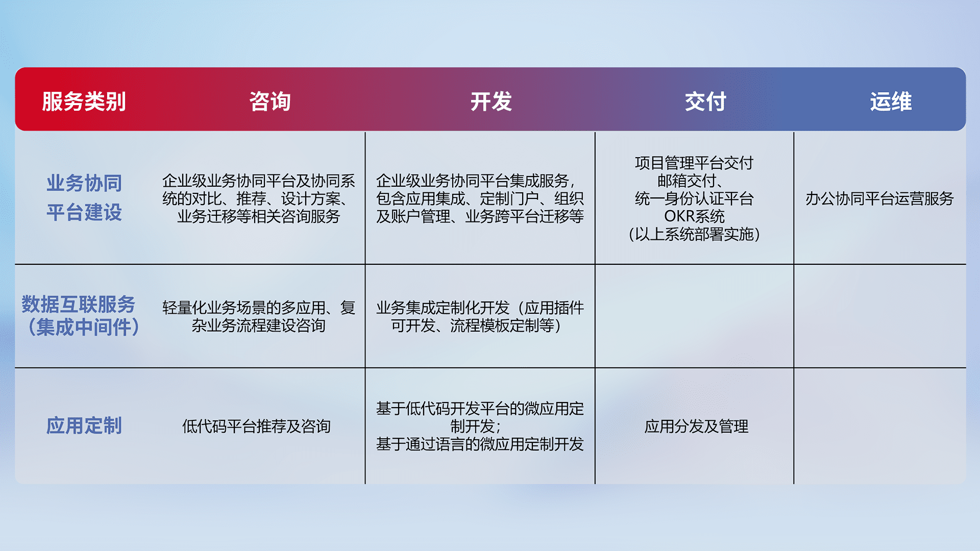 针对钉钉、、企微、、IDaas等平台级产品提供产品的规划、、方案、、、交付、、定制化开发等服务,,,实现如统一协同办公、、智能客户服务、、混合会议管理、、、、智能数据查询、、等业务场景,,,,实现数字化转型。。。